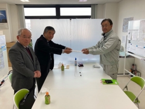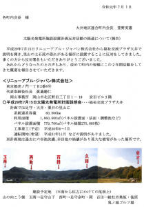 リニューアルブルジャパン岡山事務所に、萱野連合町内会長、荒木副会長、吉川さんの3名が訪問し、太陽光発電反対決議書を大笹所長に手渡し、約1時間半意見交換しました。