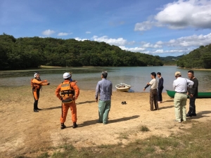研究会のメインは午後の着衣水泳。岡山市消防局航空隊員の指導者のもと、着衣水泳、ペットボトルやライフジャケットを利用した水中浮遊。また命綱やボートを利用した救助技術の体験も実施しました。「命綱は救助対象者を投げ越すように投げると綱をつかみやすい」「自力だけでは浮くのも精一杯で、とても救助者に手をふるなどサインをおくることはできない」など、実際に体験すればこその学びがたくさんありました。