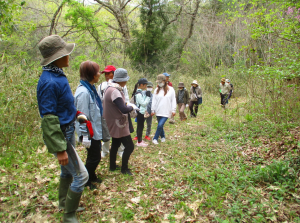 午前のフィールドワークでは、地域に生息するいきものについて講師の説明を聞きながら歩きました。